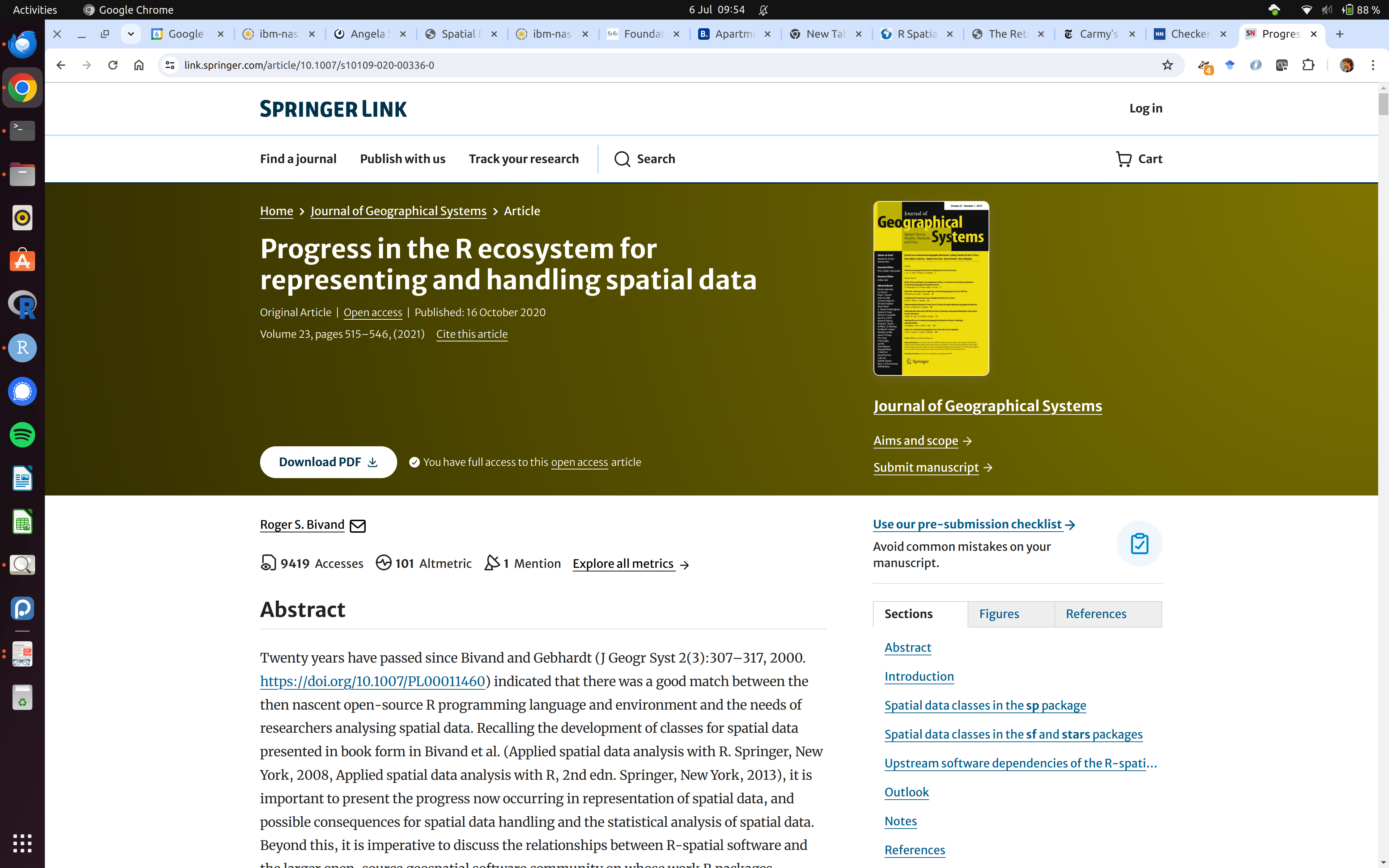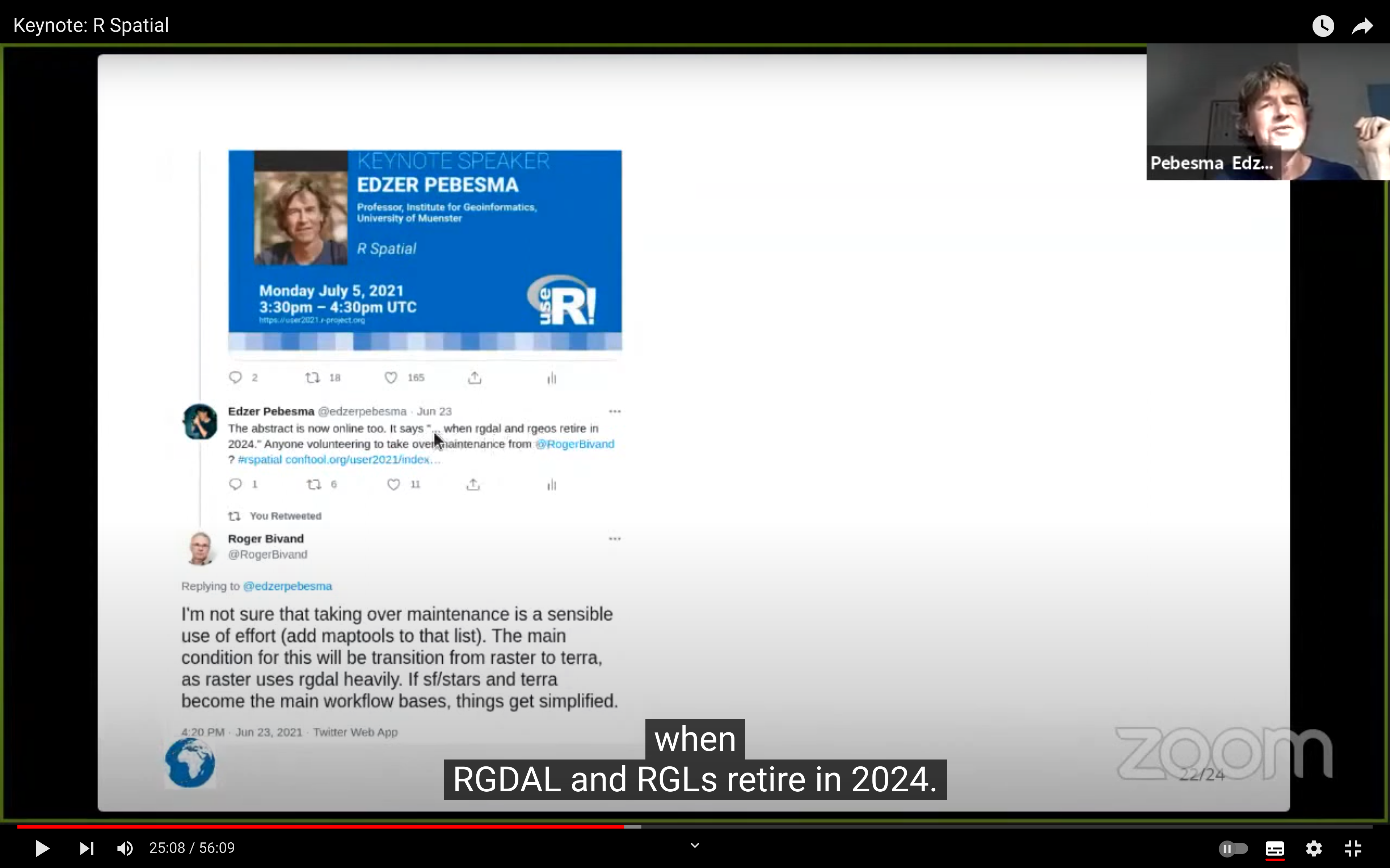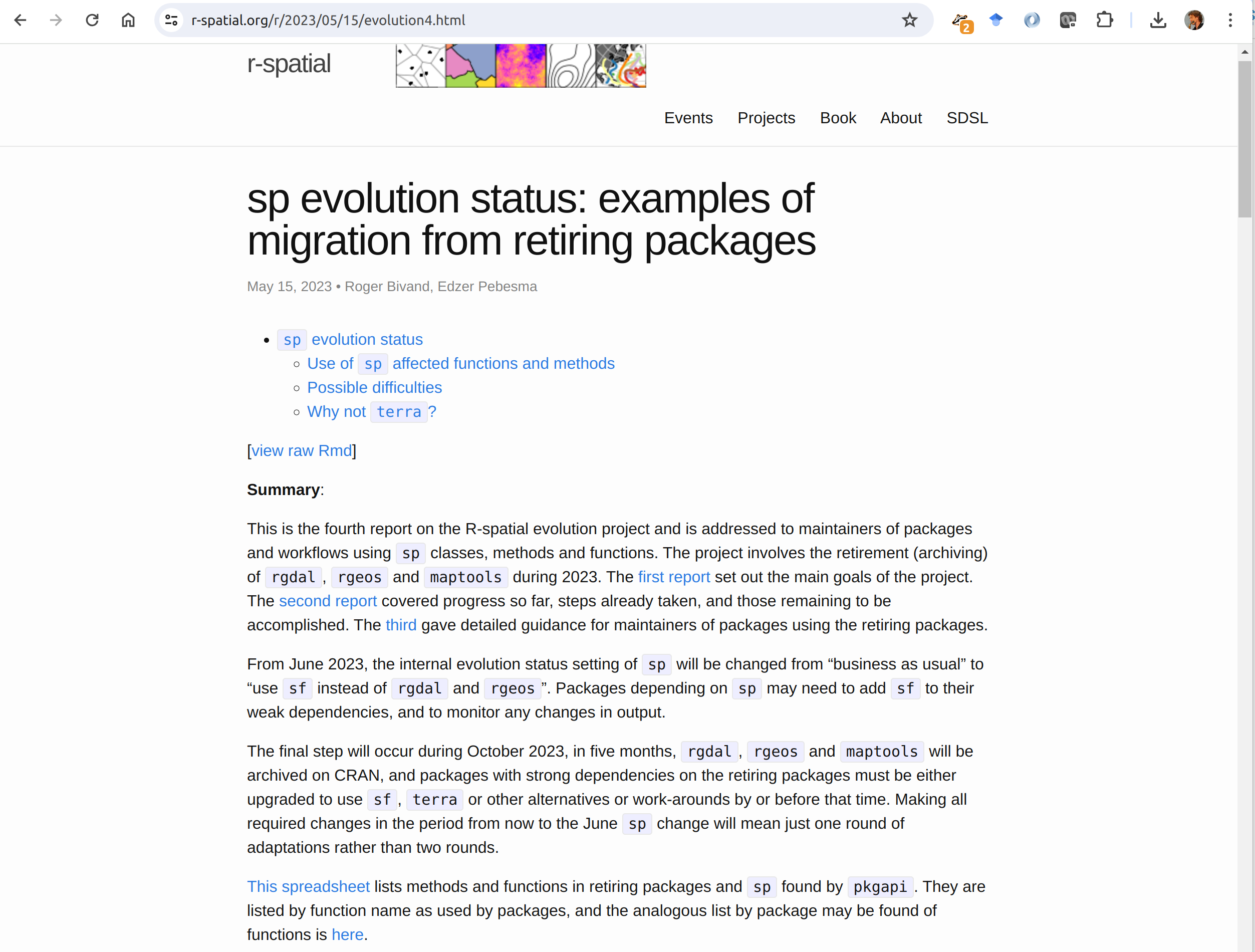 spatial)sp and rasterrgdal (2003) interfaced GDAL and PROJrgeos (2011) interfaced GEOSmaptools was a collection of various useful thingsmaps and mapprojsp predates simple features, and mirrors shapefilessf came out in 2016 and supports simple features in Rtidyverse and ggplot2stars (2018) provided classes for the raster side and data cubesterra (2020) uses S4 classes for raster and vector, and succeeds rasterrgdal, rgeos and maptools retired.Call(), rather than Rcpp or similarsf) simplifies life, a lot.stars (2018) and terra (2020)raster dropped dependency on rgdal and rgeos (Sept 2022), using terra insteadsp (worried people who were not affected!)rgdal and rgeos dependencies of sp in favour of sf in june 2023